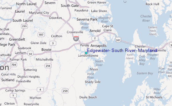 Use this relief map to navigate to tide stations, surf breaks and cities that are in the area of Edgewater, South River, Maryland.