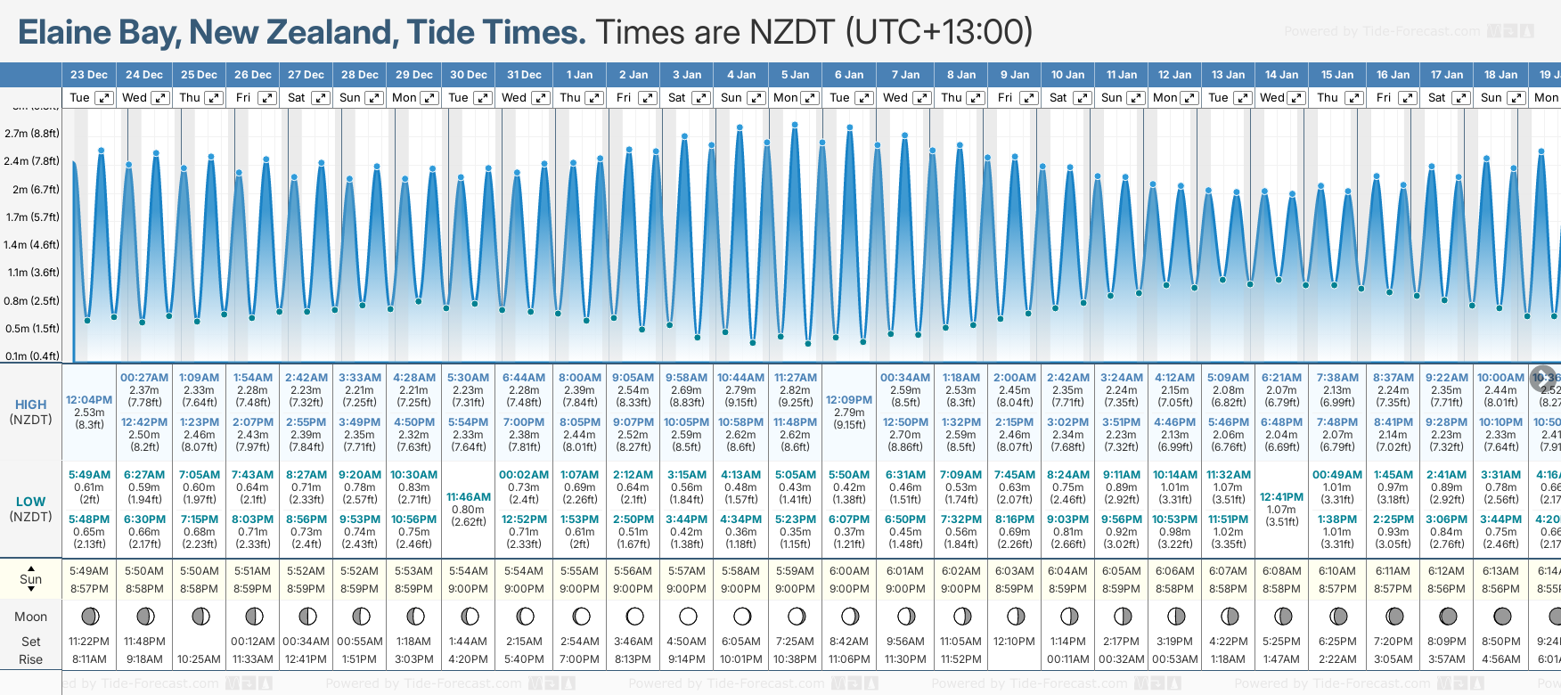 Tide Times are NZDT (UTC +13.0hrs). Last Spring High Tide at Elaine Bay was on Tue 23 Dec (height: 2.55m 8.4ft). Next high Spring Tide at Elaine Bay will be on Tue 06 Jan (height: 2.82m 9.3ft).