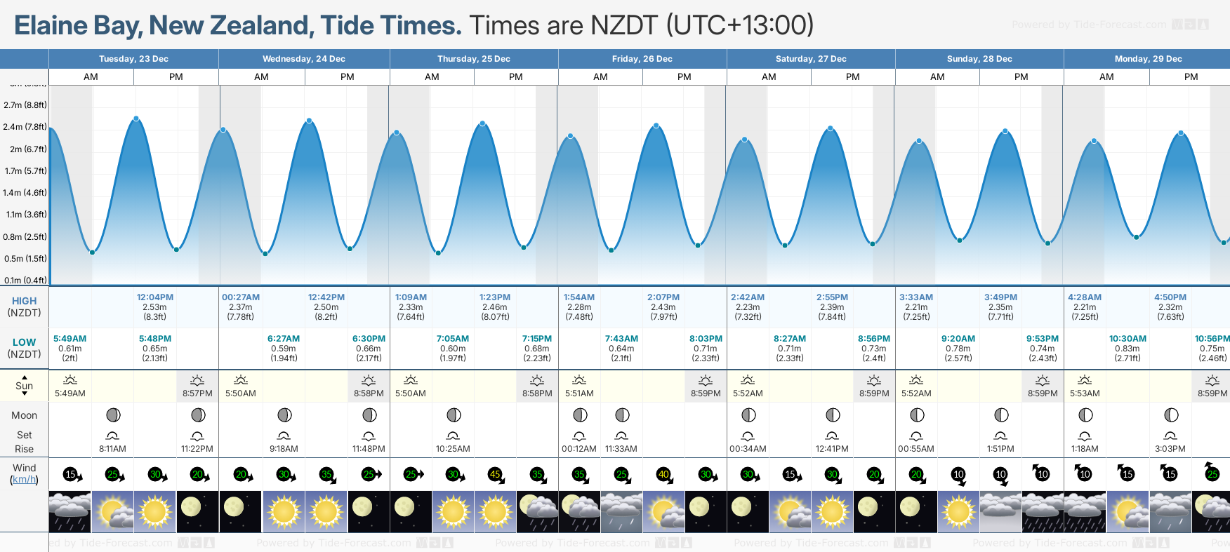 Tide chart for Elaine BayShowing low and high tide times for the next 30 days at Elaine Bay. Tide Times are NZDT (UTC +13.0hrs).