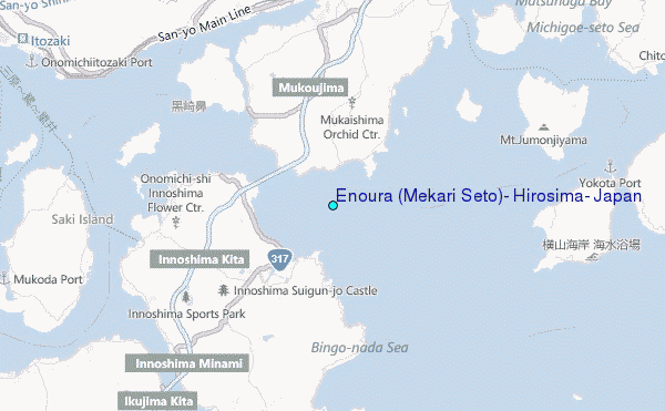 Use this relief map to navigate to tide stations, surf breaks and cities that are in the area of Enoura (Mekari Seto), Hirosima, Japan.