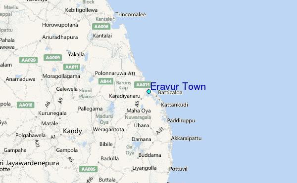 Use this relief map to navigate to tide stations, surf breaks and cities that are in the area of Eravur Town.