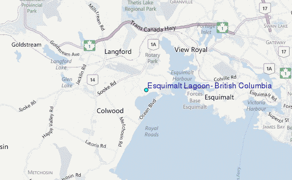 Use this relief map to navigate to tide stations, surf breaks and cities that are in the area of Esquimalt Lagoon, British Columbia.