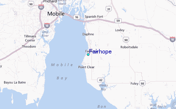 Use this relief map to navigate to tide stations, surf breaks and cities that are in the area of Fairhope.
