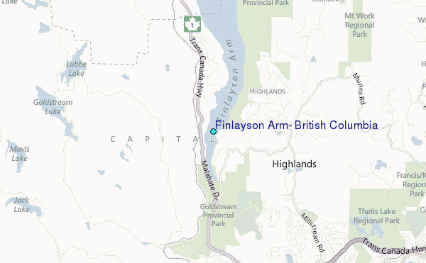 Use this relief map to navigate to tide stations, surf breaks and cities that are in the area of Finlayson Arm, British Columbia.