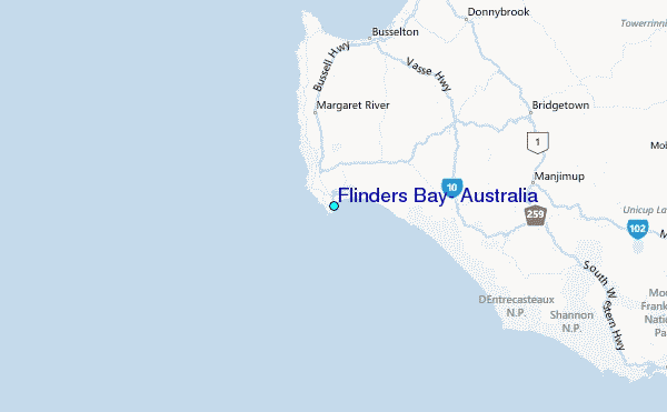 Use this relief map to navigate to tide stations, surf breaks and cities that are in the area of Flinders Bay, Australia.