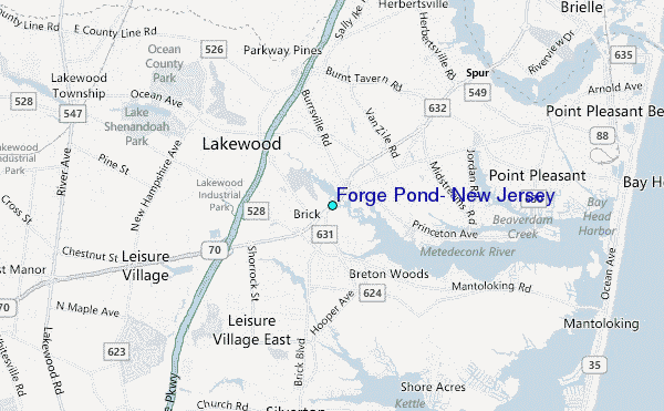Use this relief map to navigate to tide stations, surf breaks and cities that are in the area of Forge Pond, New Jersey.