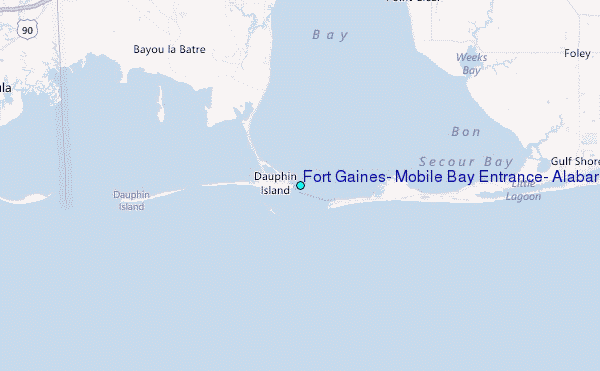 Use this relief map to navigate to tide stations, surf breaks and cities that are in the area of Fort Gaines, Mobile Bay Entrance, Alabama.