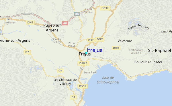Use this relief map to navigate to tide stations, surf breaks and cities that are in the area of Frejus.