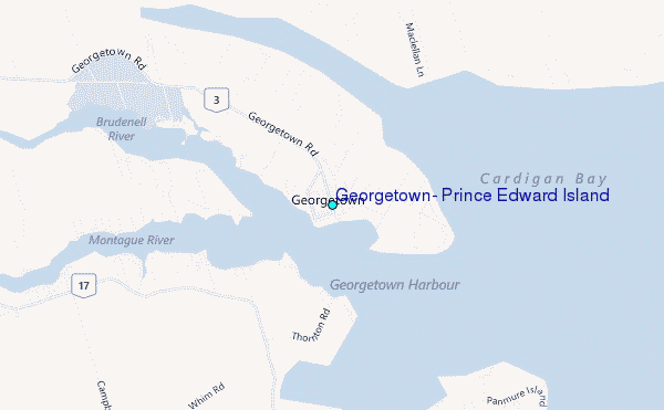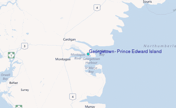 Use this relief map to navigate to tide stations, surf breaks and cities that are in the area of Georgetown, Prince Edward Island.