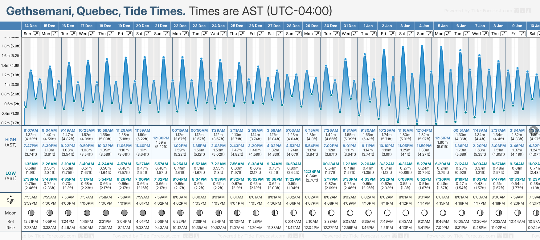 Tide chart for GethsemaniShowing low and high tide times for the next 30 days at Gethsemani. Tide Times are AST (UTC -4.0hrs).