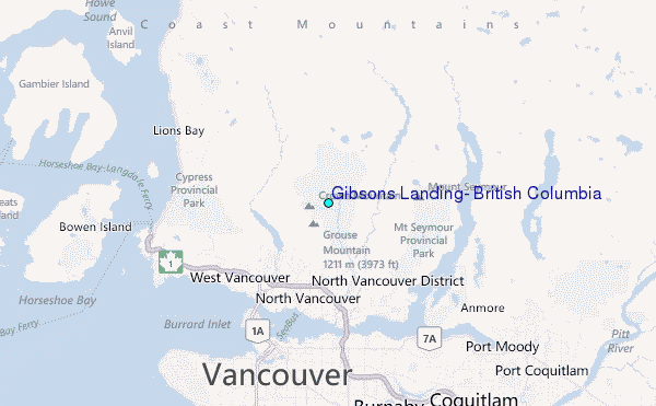 Use this relief map to navigate to tide stations, surf breaks and cities that are in the area of Gibsons Landing, British Columbia.