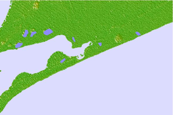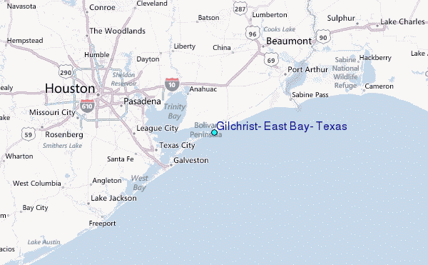 Use this relief map to navigate to tide stations, surf breaks and cities that are in the area of Gilchrist, East Bay, Texas.