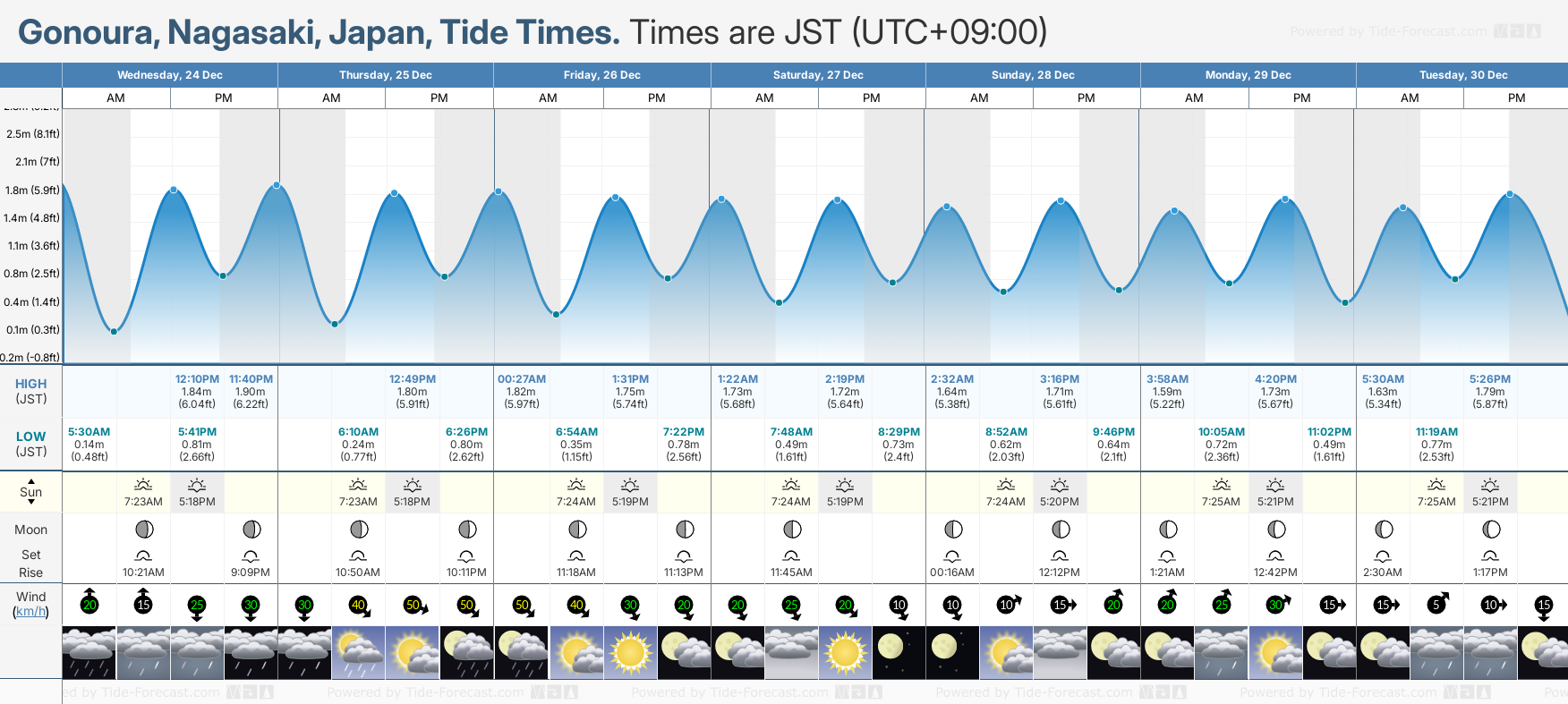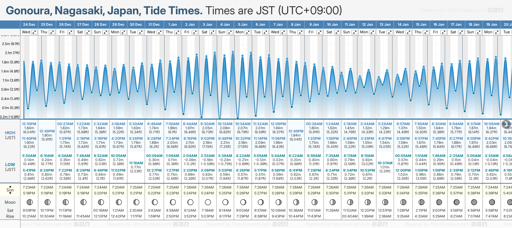 Tide Times are JST (UTC +9.0hrs). Last Spring High Tide at Gonoura was on Mon 22 Dec (height: 2.00m 6.6ft). Next high Spring Tide at Gonoura will be on Mon 05 Jan (height: 2.21m 7.3ft).