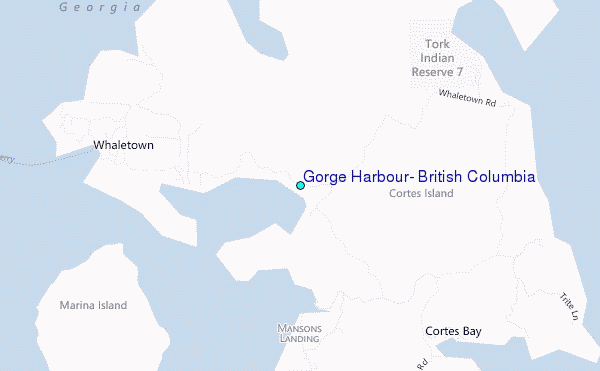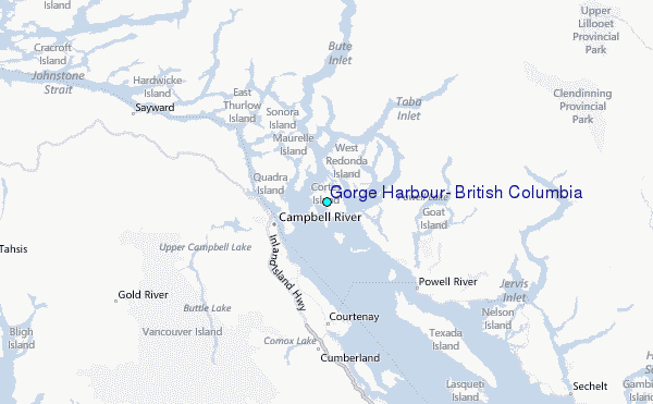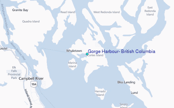 Use this relief map to navigate to tide stations, surf breaks and cities that are in the area of Gorge Harbour, British Columbia.