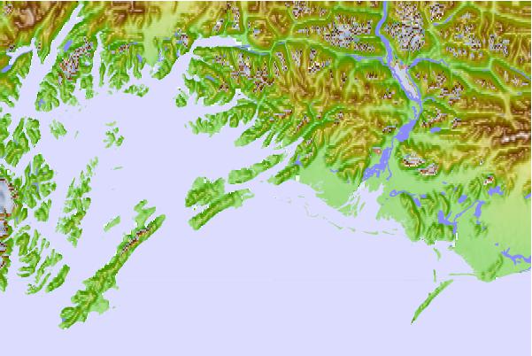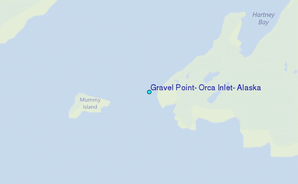 Use this relief map to navigate to tide stations, surf breaks and cities that are in the area of Gravel Point, Orca Inlet, Alaska.