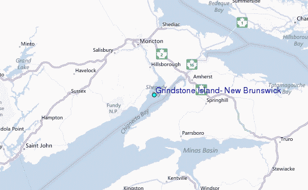 Use this relief map to navigate to tide stations, surf breaks and cities that are in the area of Grindstone Island, New Brunswick.