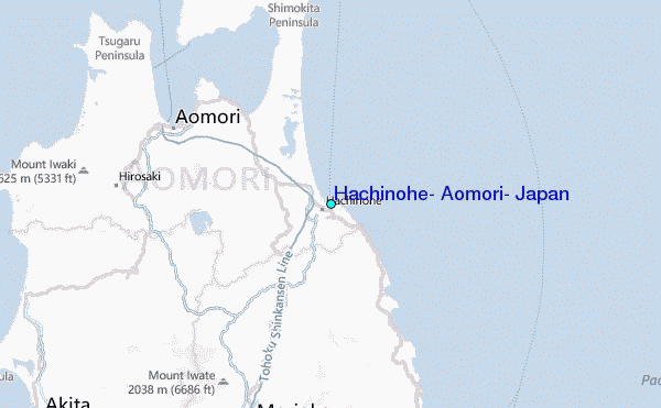 Use this relief map to navigate to tide stations, surf breaks and cities that are in the area of Hachinohe, Aomori, Japan.