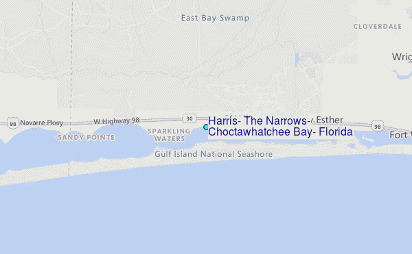 Use this relief map to navigate to tide stations, surf breaks and cities that are in the area of Harris, The Narrows, Choctawhatchee Bay, Florida.