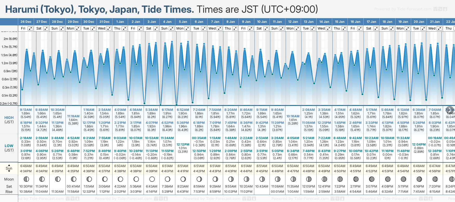 December and January Tide charts for Harumi (Tokyo): The tide charts below show the height, time and date of high and low tides for the next 30 days.