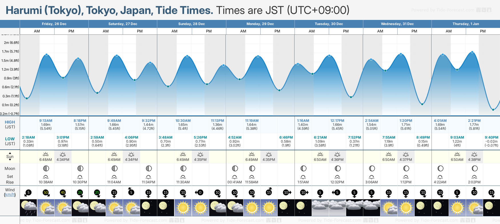 Tide chart for Harumi (Tokyo)Showing low and high tide times for the next 30 days at Harumi (Tokyo). Tide Times are JST (UTC +9.0hrs).