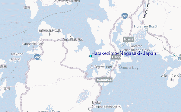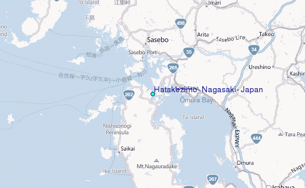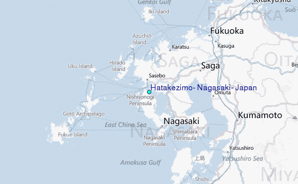 Use this relief map to navigate to tide stations, surf breaks and cities that are in the area of Hatakezimo, Nagasaki, Japan.