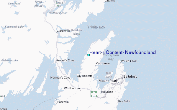 Use this relief map to navigate to tide stations, surf breaks and cities that are in the area of Heart's Content, Newfoundland.