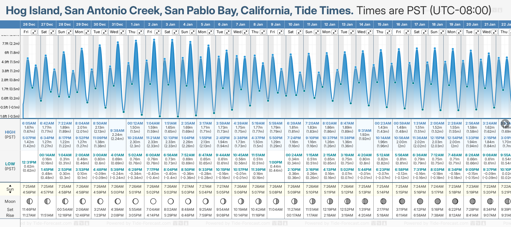 December and January Tide charts for Hog Island, San Antonio Creek, San Pablo Bay: The tide charts below show the height, time and date of high and low tides for the next 30 days.