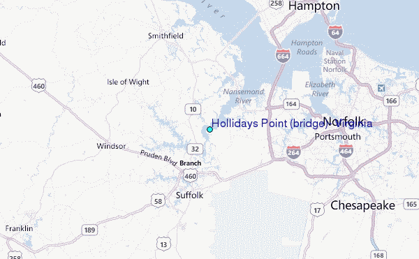Use this relief map to navigate to tide stations, surf breaks and cities that are in the area of Hollidays Point (bridge), Virginia.