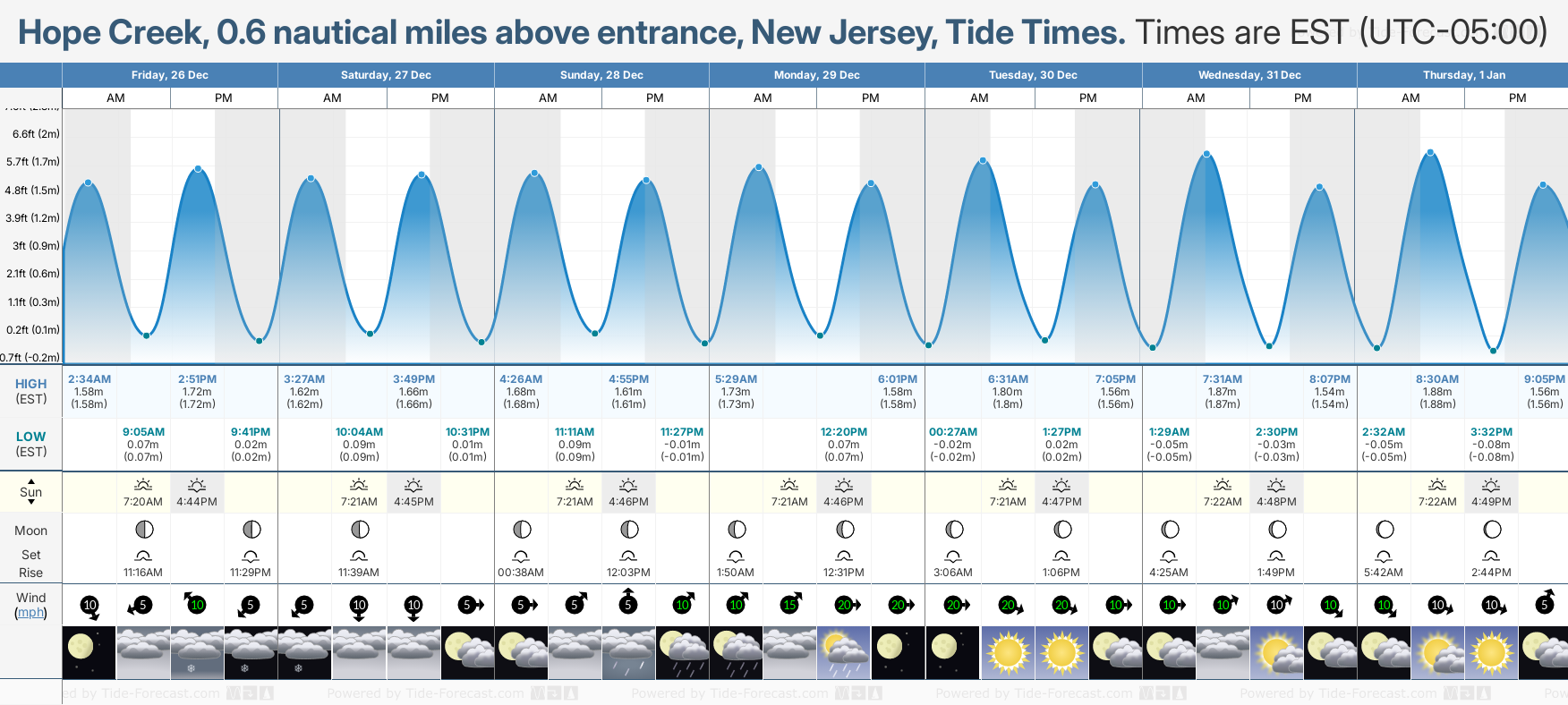 Tide Times are EST (UTC -5.0hrs). Last Spring High Tide at Hope Creek, 0.6 nautical miles above entrance was on Tue 23 Dec (height: 1.79m 5.9ft). Next high Spring Tide at Hope Creek, 0.6 nautical miles above entrance will be on Sat 03 Jan (height: 1.93m 6.3ft).