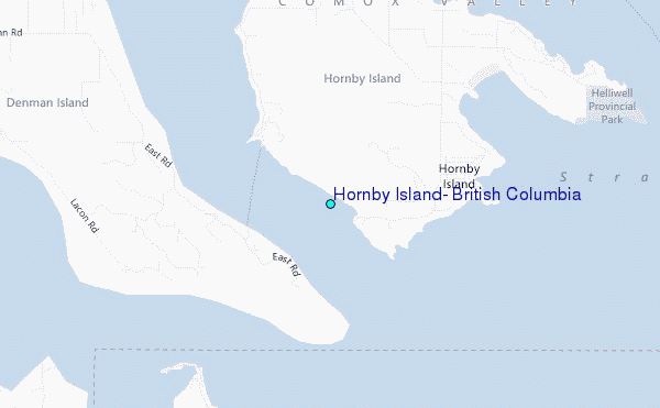 Use this relief map to navigate to tide stations, surf breaks and cities that are in the area of Hornby Island, British Columbia.