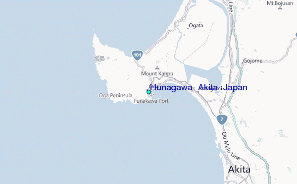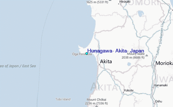 Use this relief map to navigate to tide stations, surf breaks and cities that are in the area of Hunagawa, Akita, Japan.
