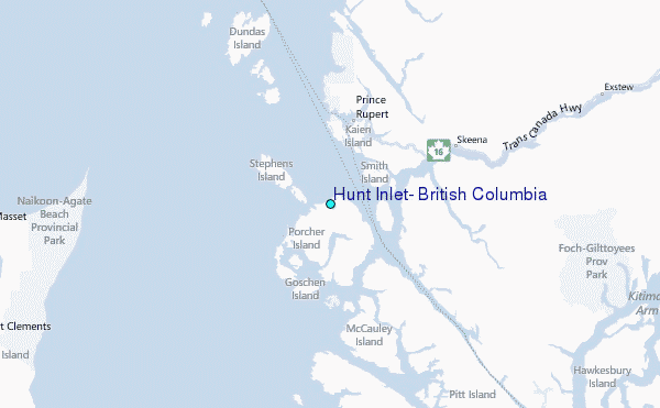 Use this relief map to navigate to tide stations, surf breaks and cities that are in the area of Hunt Inlet, British Columbia.