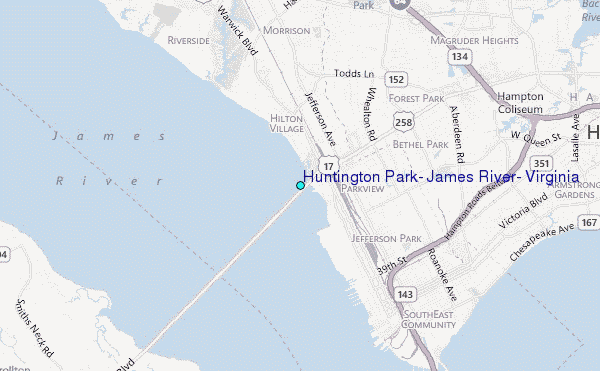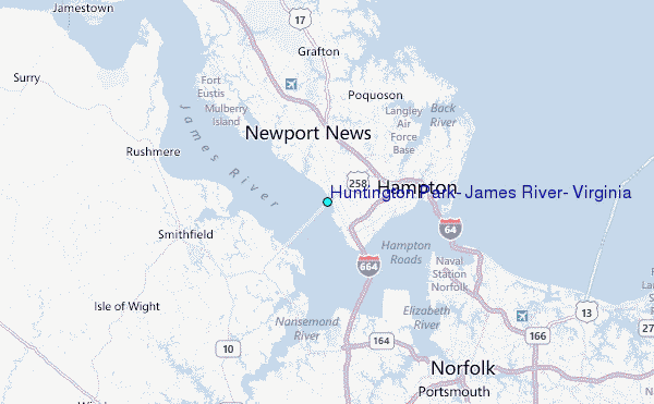 Use this relief map to navigate to tide stations, surf breaks and cities that are in the area of Huntington Park, James River, Virginia.