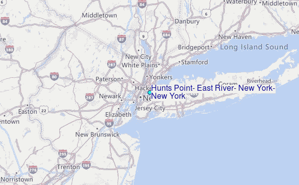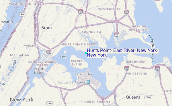 Use this relief map to navigate to tide stations, surf breaks and cities that are in the area of Hunts Point, East River, New York, New York.