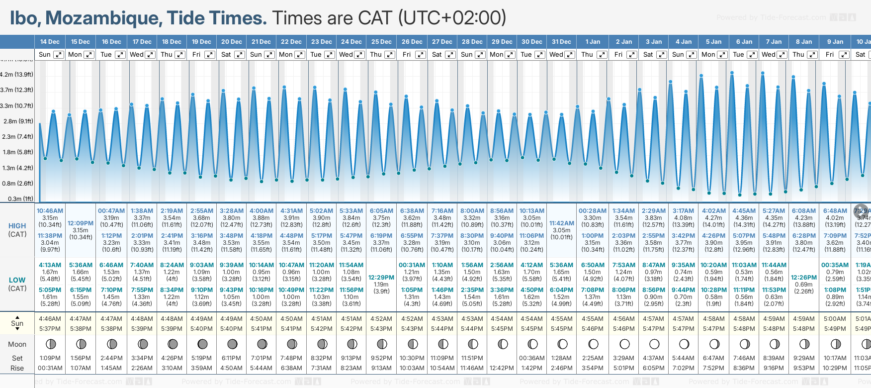 December and January Tide charts for Ibo: The tide charts below show the height, time and date of high and low tides for the next 30 days.