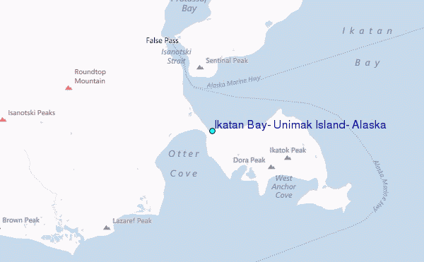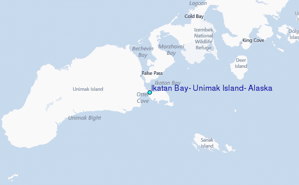 Use this relief map to navigate to tide stations, surf breaks and cities that are in the area of Ikatan Bay, Unimak Island, Alaska.