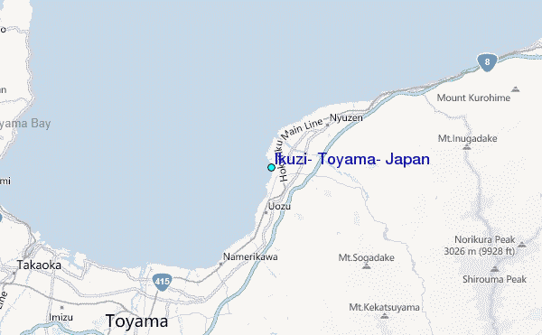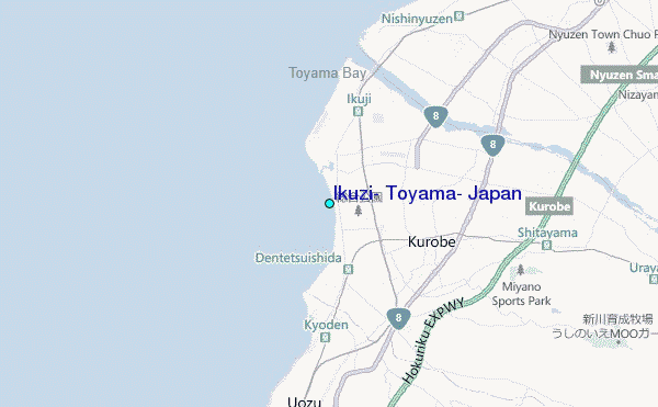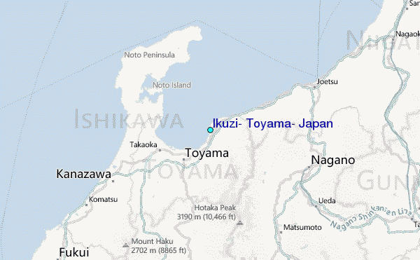 Use this relief map to navigate to tide stations, surf breaks and cities that are in the area of Ikuzi, Toyama, Japan.