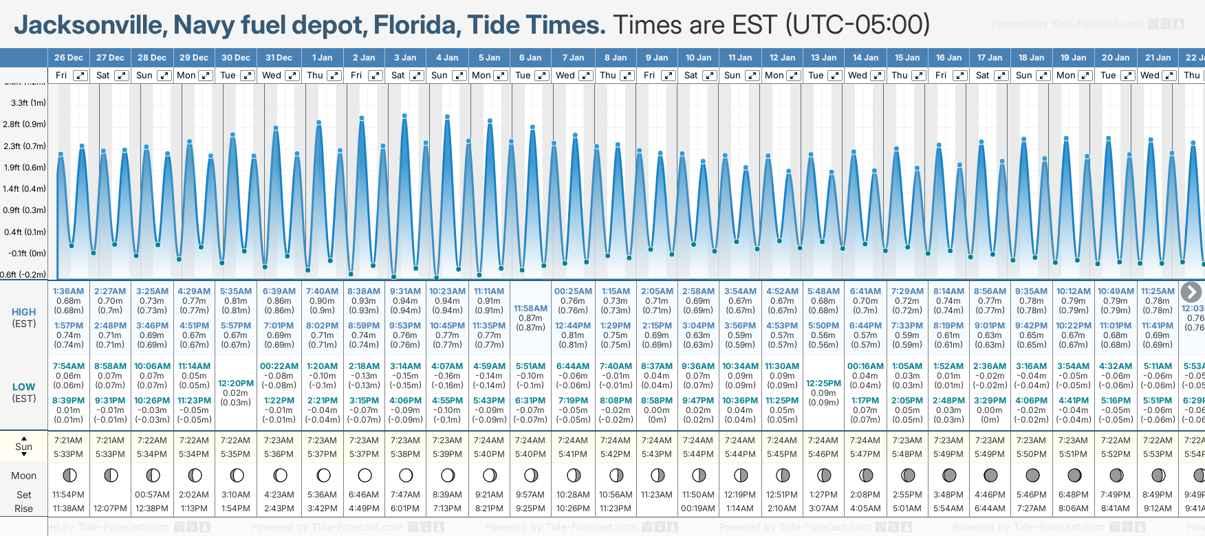 December and January Tide charts for Jacksonville, Navy fuel depot: The tide charts below show the height, time and date of high and low tides for the next 30 days.