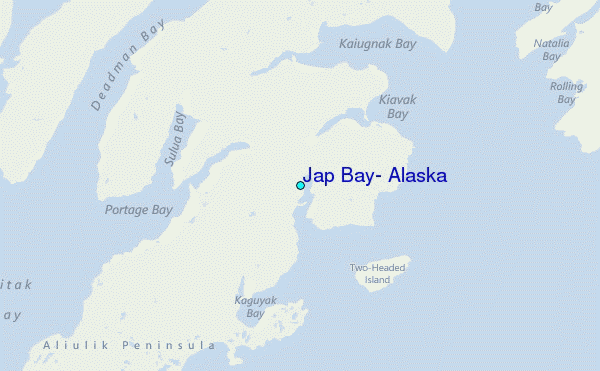 Use this relief map to navigate to tide stations, surf breaks and cities that are in the area of Jap Bay, Alaska.