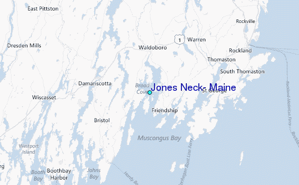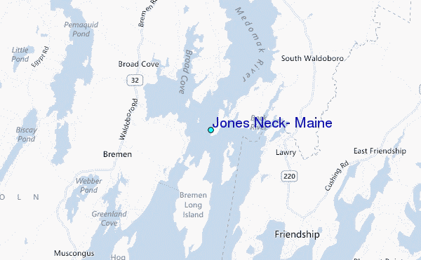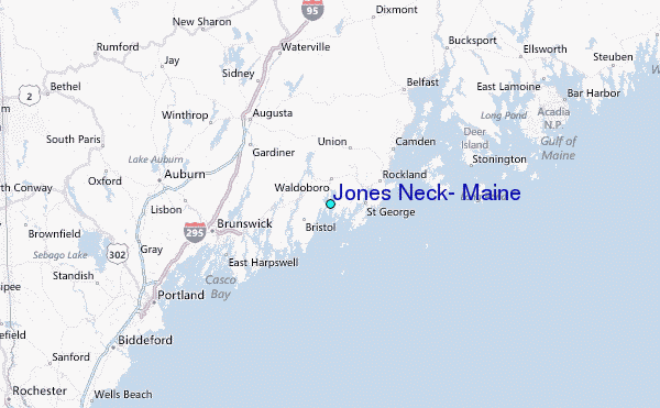 Use this relief map to navigate to tide stations, surf breaks and cities that are in the area of Jones Neck, Maine.