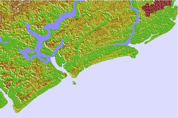 Use this relief map to navigate to tide stations, surf breaks and cities that are in the area of Kiawah River Bridge, South Carolina.