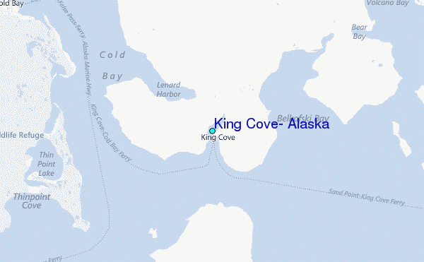 Use this relief map to navigate to tide stations, surf breaks and cities that are in the area of King Cove, Alaska.