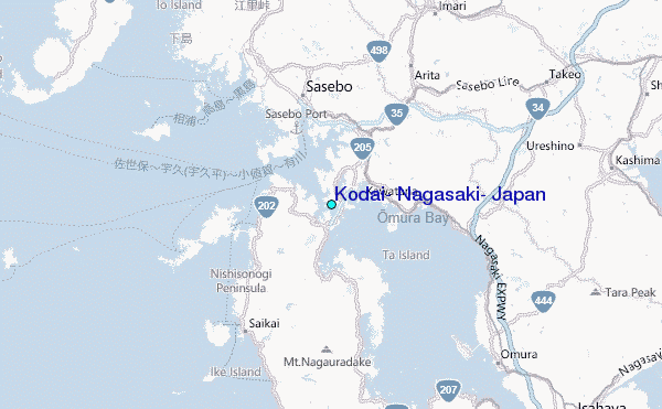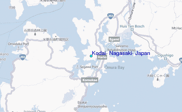 Use this relief map to navigate to tide stations, surf breaks and cities that are in the area of Kodai, Nagasaki, Japan.