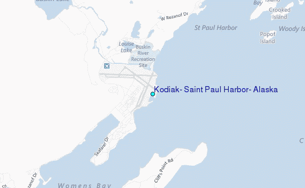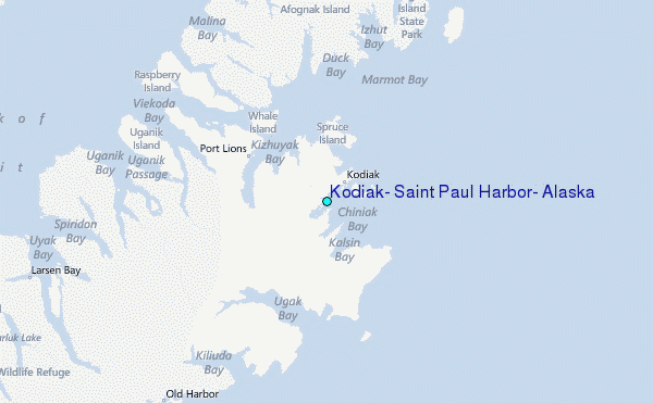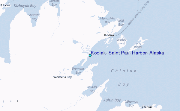 Use this relief map to navigate to tide stations, surf breaks and cities that are in the area of Kodiak, Saint Paul Harbor, Alaska.