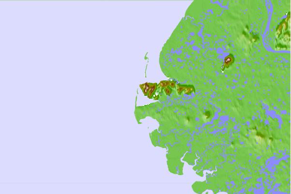 Use this relief map to navigate to tide stations, surf breaks and cities that are in the area of Kokechik Bay, Cape Romanzof, Alaska.