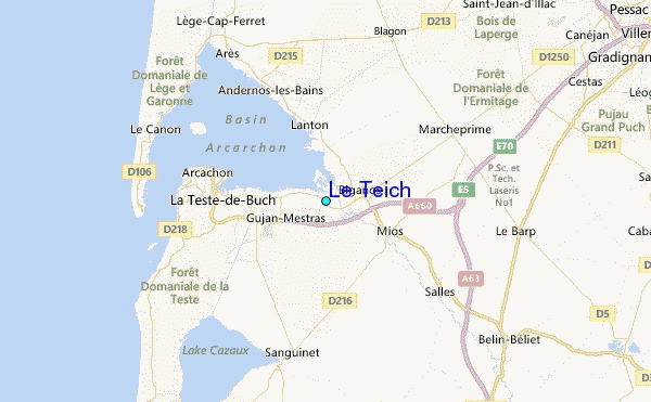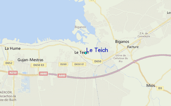 Use this relief map to navigate to tide stations, surf breaks and cities that are in the area of Le Teich.