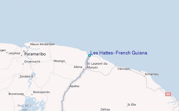 Use this relief map to navigate to tide stations, surf breaks and cities that are in the area of Les Hattes, French Guiana.