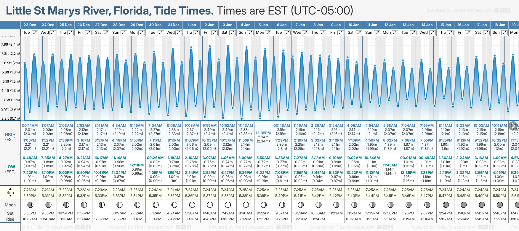 December and January Tide charts for Little St Marys River: The tide charts below show the height, time and date of high and low tides for the next 30 days.