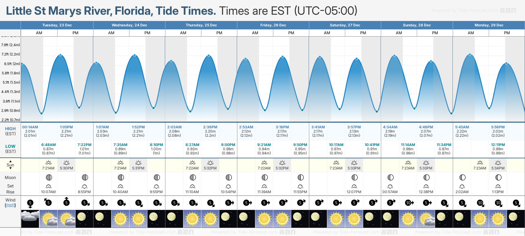 Tide Times are EST (UTC -5.0hrs). Last Spring High Tide at Little St Marys River was on Mon 22 Dec (height: 2.21m 7.3ft). Next high Spring Tide at Little St Marys River will be on Fri 02 Jan (height: 2.40m 7.9ft).