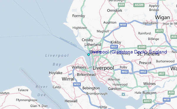 Use this relief map to navigate to tide stations, surf breaks and cities that are in the area of Liverpool (Gladstone Dock), England.
